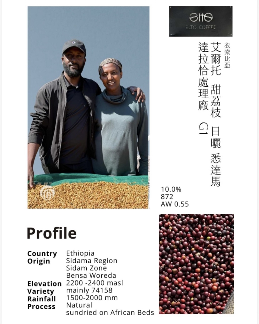 購買生豆只限順豐到付 或門市自取 [Elto] 衣索比亞 艾爾托 甜荔枝 日曬 西達馬 達拉恰處理廠 G1 [Elto] Ethiopia Sidama Dalecha Natural G1 乾香為草莓、芒果、荔枝及些許榛果氣息,入口時同樣感受到草莓、白桃、葡萄風 味,中後段帶有淡淡的佛手柑、甜甜荔枝及榛果的香氣。