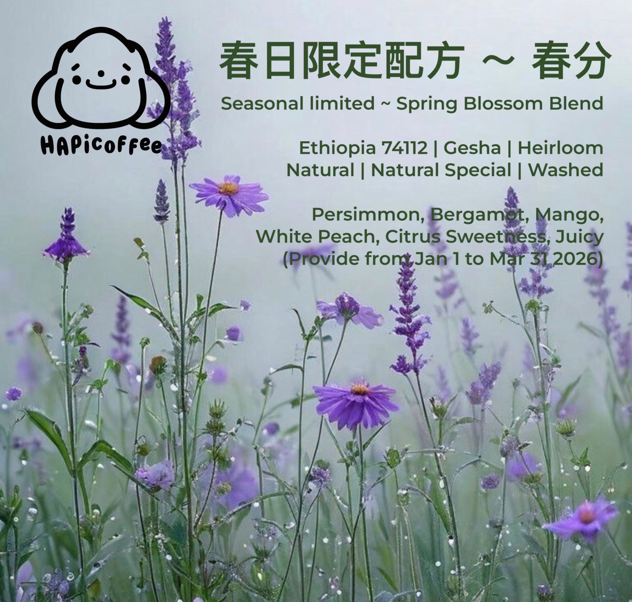 春分~ 春日限定配方 Seasonal limited ~ Spring Blossom Blend (供應期~ 1 Jan 至31 Mar 2026) Ethiopia 74112 | Gesha | Heirloom Natural | Natural Special | Washed Light medium roast Notes~ Persimmon, Bergamot, Mango, White Peach, Citrus Sweetness, Juicy Roast date 2 Jan 2026 加購CAFEC filter paper 👉https://www.hapicoffee.store/i/Xjjh72gAA https://www.hapicoffee.store/i/SO3ooQgAA 👆加購蛋糕濾紙