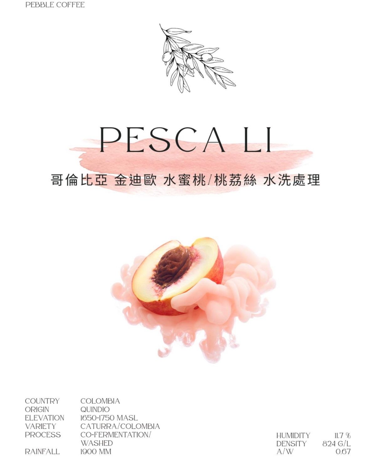 購買生豆只限順豐到付 或門市自取 哥倫比亞 金迪歐 水蜜桃/桃荔絲 水洗處理 Colombia Quindio Pesca Li Washed 乾香為水蜜桃、荔枝、草莓及輕盈甜花香。啜吸時同樣以水蜜桃汁、新鮮荔枝及草莓 風味為主調,伴隨著杏桃乾與橙皮香氣,香甜多汁。